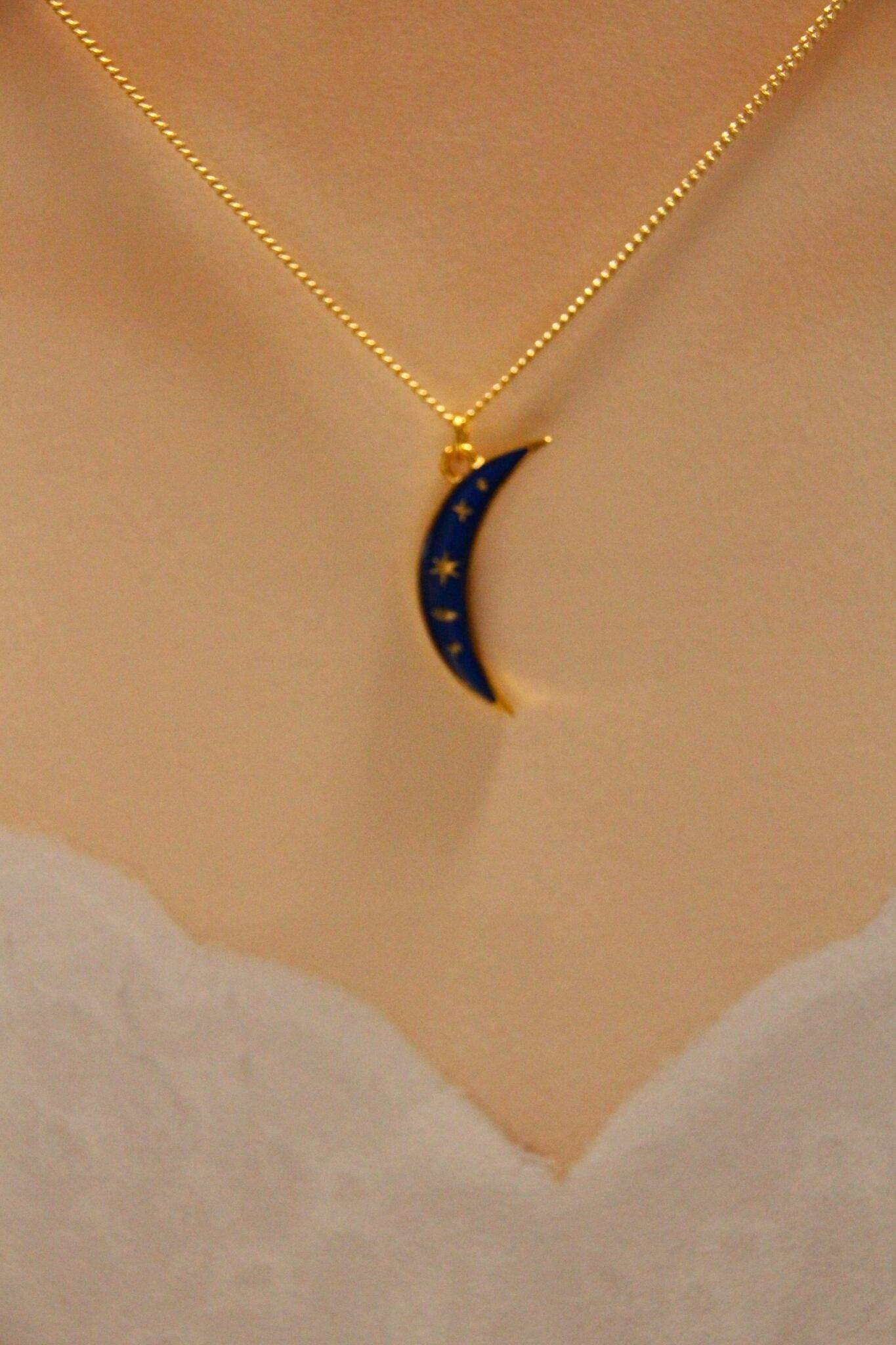 このネックレスは、幻想的なブルーの三日月をあしらったデザインで、神秘的な雰囲気を持つアイテムです。胸元で優雅に揺れるたびに、魅力的な輝きを放ち、あなたのスタイルに特別なアクセントを加えます。